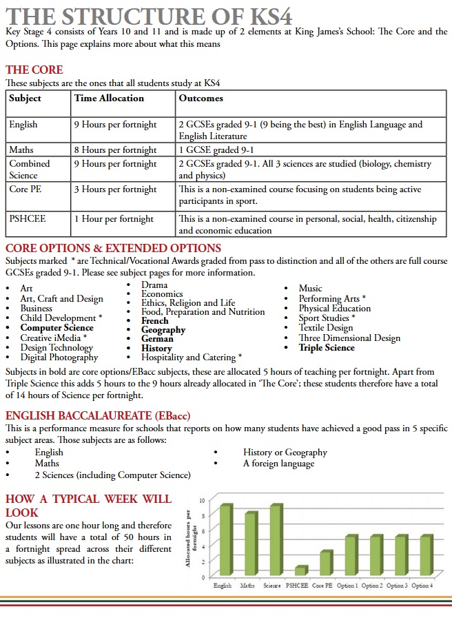 Below you can see an extract from the Options Booklet that summarises the range of options on offer and how students make up their 9 Key Stage 4 subjects: